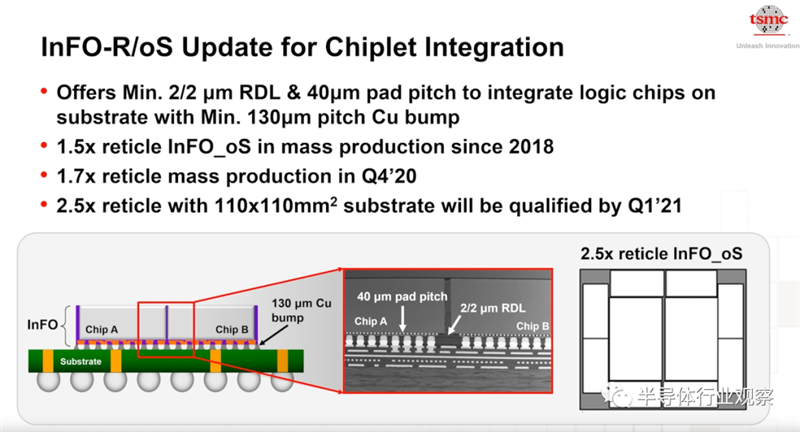 接下来我们看一下InFo技术在logic chilets整合方面的应用,其中,InFo-R的应用越来越多,这是因为InFo-R在带宽和Cycle time等多方面的优势。如下图所示,InFo-R能提供高密度RDL。在水平方向上,InFo-R能提供了最小线宽和线距仅为2μm的连线。在垂直方面,这个技术提供了40μm的micro bump和130μm的Cu Bump。随着HPC等应用的需求,台积电计划明年推出2.5倍InFo-R的验证。在余振华看来,行业需要110平方毫米的的基板来做整合。这不但代表了新的挑战,还带来了新的机会。