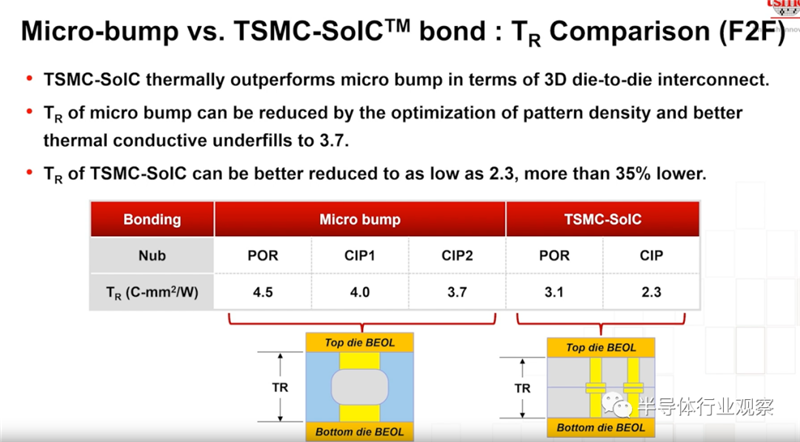余振华进一步指出,在我们进行3D堆叠时,对系统的散热会提出更高的需求,从下图我们可以看到相关散热效果对比.由此图可以看到爱几点SoIC技术在散热方面的优势。从台积电提供的数据可以看到,这个提升高达35%。