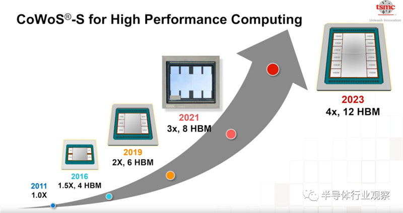 来到COWoS-S技术方面,据余振华介绍,台积电在十年前就与领先的客户推出了相关技术。并开 启了近代先进系统整合的年代。根据规划,到明年,台积电在这方面的技术能支撑在设计中整合逻辑和8个HBM。把reticle size提高到三倍。到2023年整合的HBM更将高达12个。