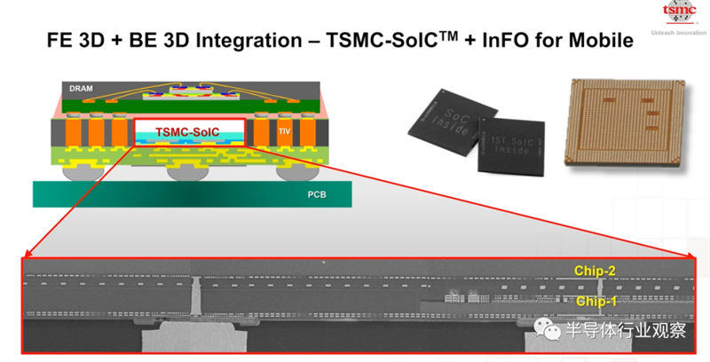 为了实现More Moore和Moore than Moore的高度整合,台积电开发了业界第一个前段3D与后段3D整合的方案。下图展现了SoIC与InFo的整合。达到了最佳的系统PPAC。