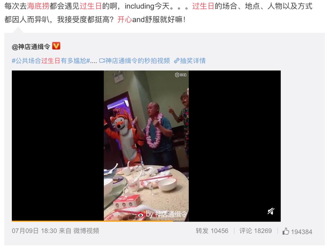 人群、欢笑、祝福、礼物。每一项应该在生日出现的要件,海底捞都帮助顾客实现了;
