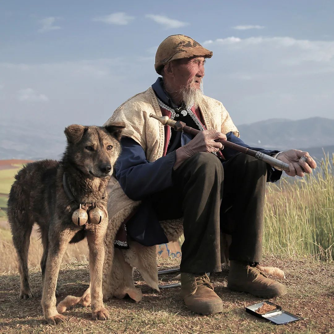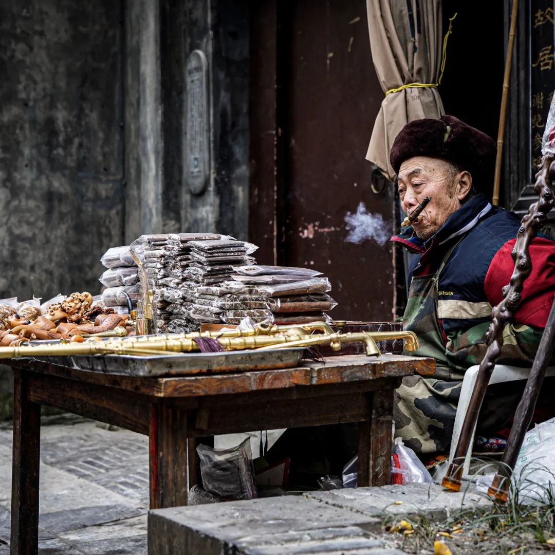 老烟民的烟袋和烟杆随身携带