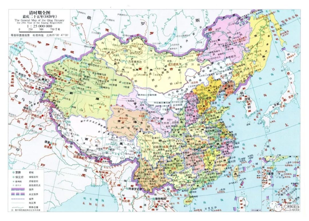 笔者所见较早的完全不包括属国的清朝疆域全图,是完成于1818年的嘉庆朝《钦定大清会典图》中的《皇舆全图》。该图无经纬网,绘制不够精确。但我们可以明确看到,该图不仅以“俄罗斯界”“缅甸界”等字样来区分清朝疆域的内外,而且不再绘入任何外邦和属国的疆土。其后,成书于1842年的《嘉庆重修一统志》所载《皇舆全图》,与此情况类似。
