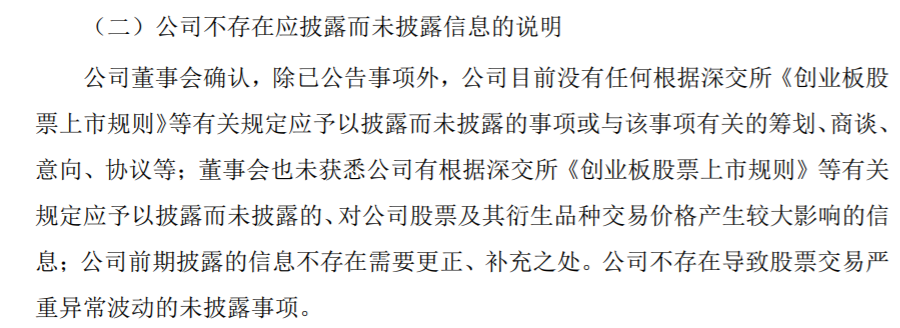 9月1日晚,公司披露核查结果。公司董事会确认,除已公告事项外,公司目前没有任何根据深交所《创业板股票上市规则》等有关规定应予以披露而未披露的事项或与该事项有关的筹划、商谈、意向、协议等;董事会也未获悉公司有根据深交所《创业板股票上市规则》等有关规定应予以披露而未披露的、对公司股票及其衍生品种交易价格产生较大影响的信息;公司前期披露的信息不存在需要更正、补充之处。公司不存在导致股票交易严重异常波动的未披露事项。