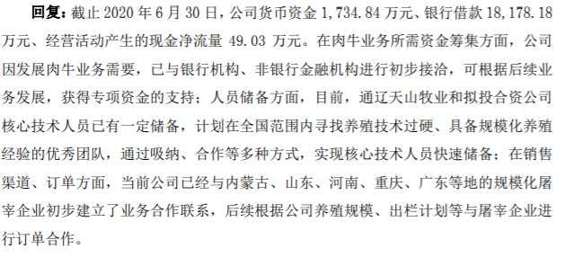 此外,深交所还要求公司说明短期内是否具备大力布局肉牛育肥业务所需的资金、人员、销售渠道、订单等条件。公司称,截至6月30日,公司货币资金1734.84万元、银行借款1.82亿元、经营活动产生的现金净流量49.03万元。在肉牛业务所需资金筹集方面,公司因发展肉牛业务需要,已与银行机构、非银行金融机构进行初步接洽,可根据后续业务发展,获得专项资金的支持。