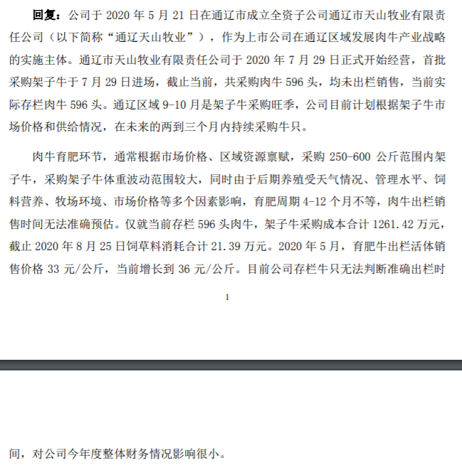 随着核查结果披露的还有公司对深交所关注函的回复。对于肉牛育肥业务对公司全年业绩的影响,公司回复称,公司5月21日在通辽市成立全资子公司通辽天山牧业,作为上市公司在通辽区域发展肉牛产业战略的实施主体。通辽天山牧业7月29日正式开始经营,首批采购架子牛于7月29日进场,截至当前,共采购肉牛596头,均未出栏销售,当前实际存栏肉牛596头。育肥周期4-12个月不等,肉牛出栏销售时间无法准确预估。目前公司存栏牛只无法判断准确出栏时间,对公司今年度整体财务情况影响很小。