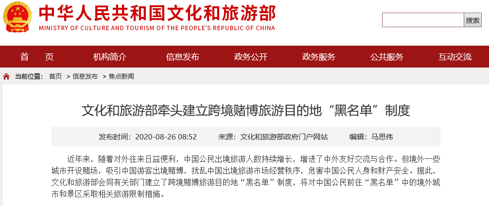 中国文化和旅游部日前公布,将会制定跨境赌博旅游点“黑名单”制度,并会采取相应的旅游限制措施。分析师认为,此举主要针对包括柬埔寨、菲律宾及越南等东南亚国家,长远将令境外博彩需求回流至澳门,但短期澳门的贵宾厅业务可能受到影响。据了解,贵宾厅博彩收入占澳门整体博彩业收入的比重约为50%。