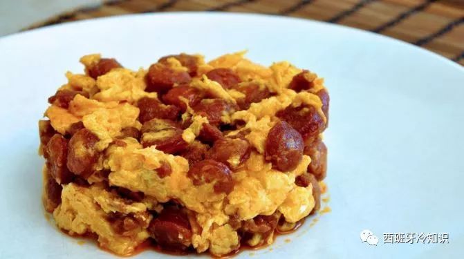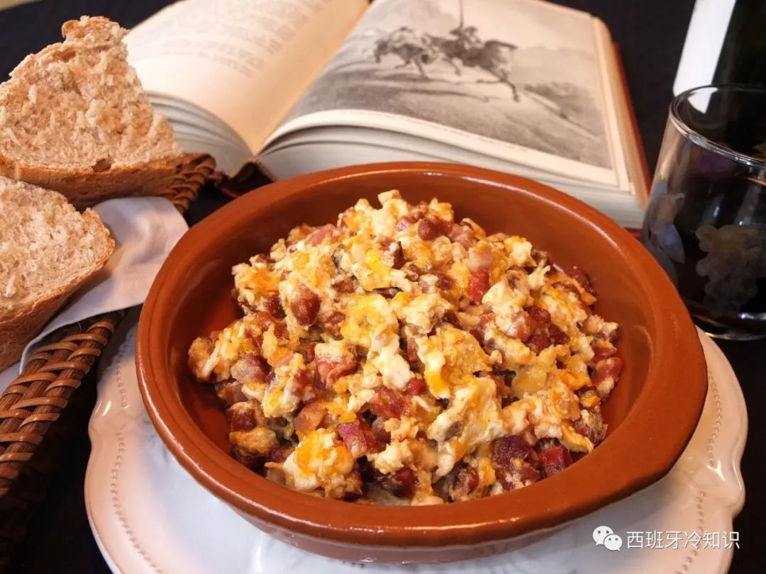 这是一道在堂吉诃德中出现过的拉曼切名菜。主要做法是鸡蛋、肉肠、火腿,猪肉干,大火炒好之后,装陶碗里上桌。