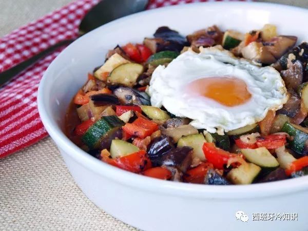 炒蔬菜丁!Pisto,意思是“切得很碎的东西”。拉曼切地区的Pisto Manchego,原料是番茄、辣椒、南瓜、洋葱、大蒜,切成丁,放大火炒熟。VIP升级奢华版,上面会盖个鸡蛋!