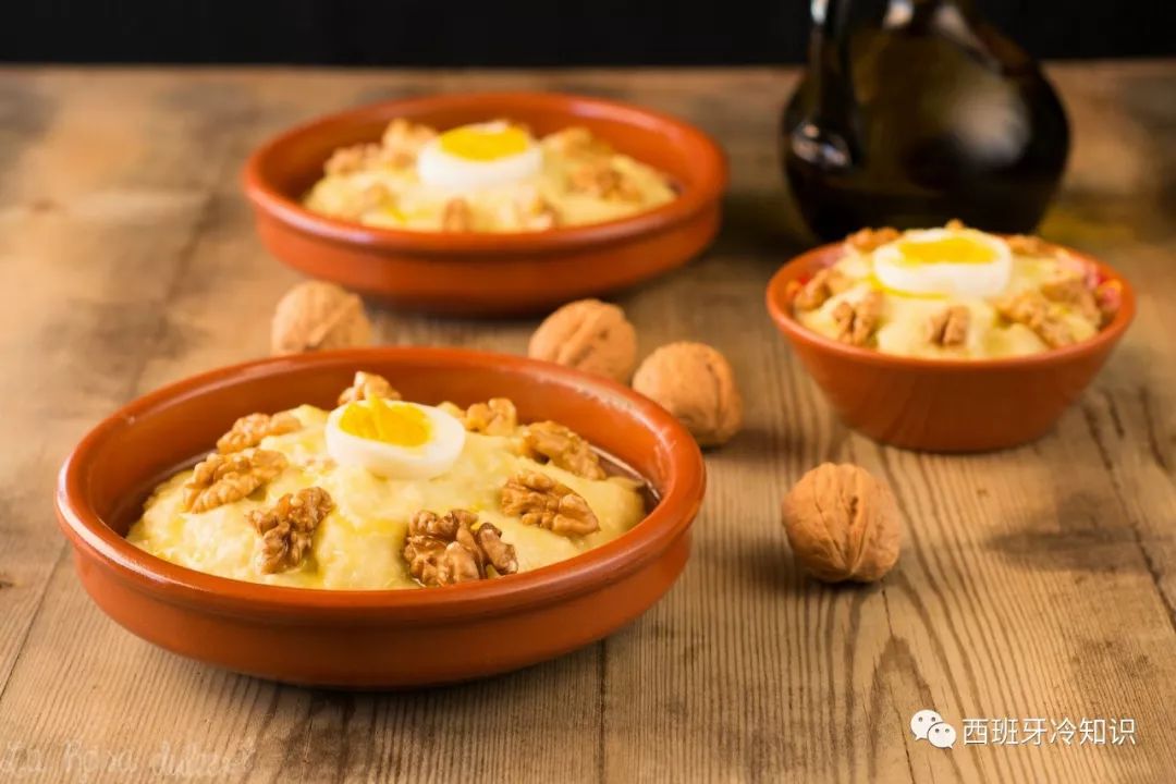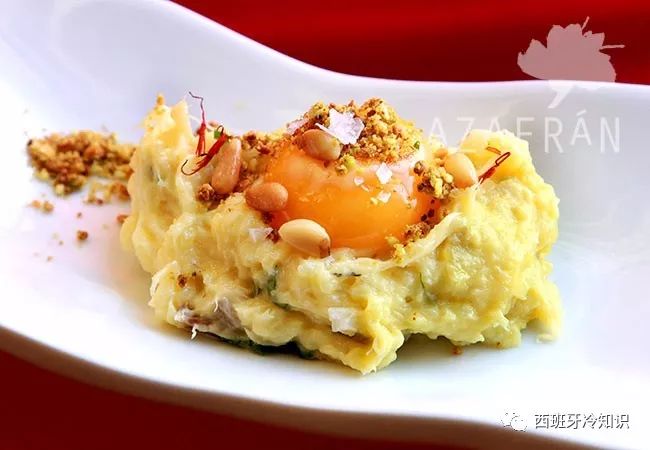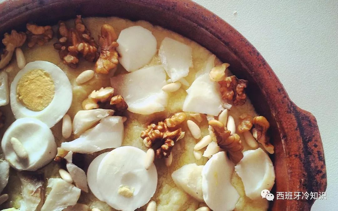煮熟的土豆 + 蒜 + 脱盐鳕鱼(bacalao desalado),捣碎,使劲搅拌,搅拌到看不到鳕鱼肉,大家都以为只是土豆泥!撒几块核桃、加半个豪华版的水煮蛋!最后,浇上一点点液体黄金:橄榄油!