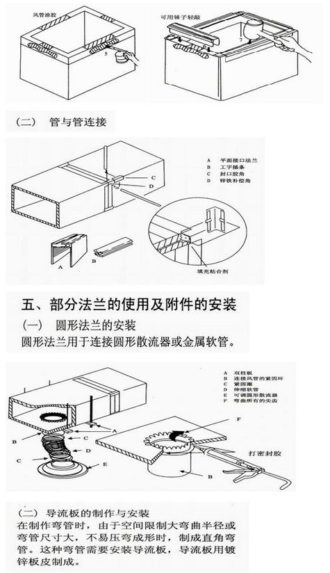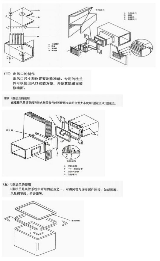 长L≥2000mm或短L≥1200mm的大风管连接、在风管上开口与支管的直角连接、风管与阀门的连接、风管与弯头的连接、三通风管与软管的连接等,均必须有相应的法兰连接。
