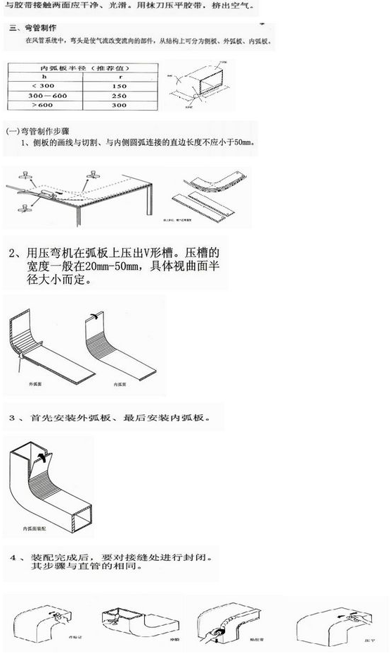 粘接部位要对准,直管折角应平直,折后都应成90度;粘接弯管时,先粘结外弧板,再粘结内弧板,并用手摸压严实,使之粘结成型。