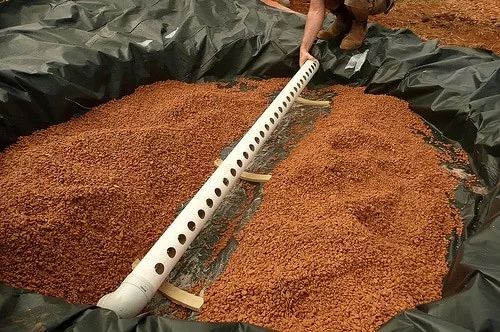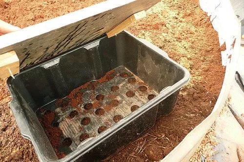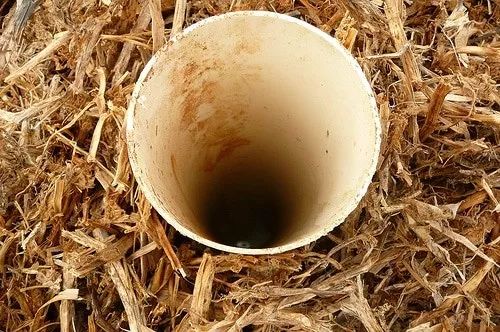 直径100MM的PVC塑料管,在上面钻一排20—30直径的孔,如图所示。在塑料管下面用40MM厚的木条支撑,用筛网包裹塑料管防止蛭石或石块堵塞。