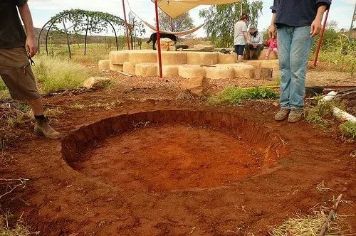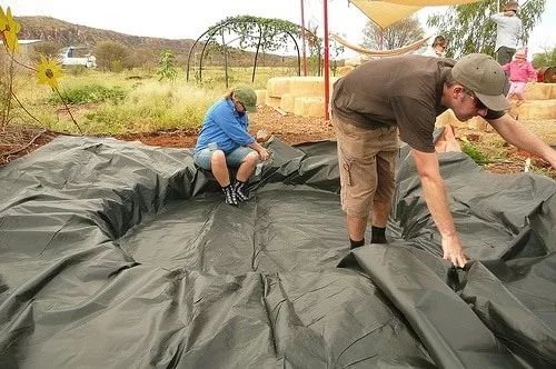 铺上防水塑料布,防止蓄水池里的水渗透出去。
