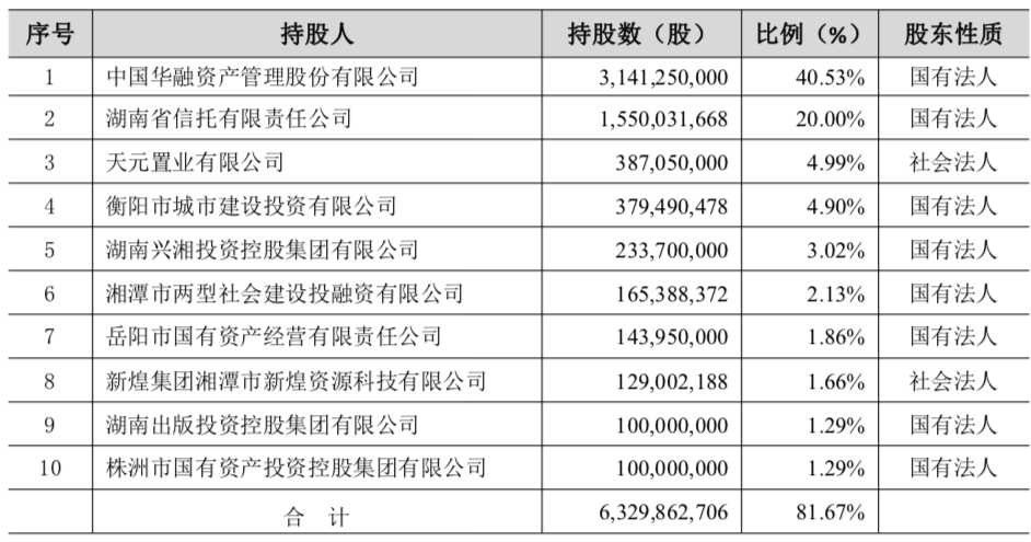 从华融湘江银行2019年年报披露的前十大股东来看,中国华融持有40.53%的股权,为第一大控股股东,其次是湖南省信托有限责任公司持有20%股权为第二大股东。