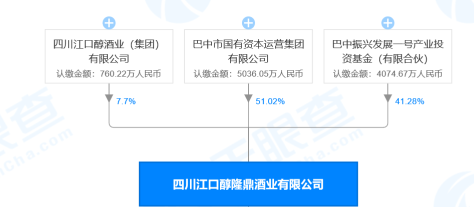 据天眼查显示,四川江口醇隆鼎酒业集团的控股股东为巴中市国有资本运营集团有限公司,占股51.02%,第二大股东为川陕发展投资绝对控股的巴中振兴发展一号产业投资基金,占股41.28%,四川江口醇酒业(集团)有限公司占股7.7%。