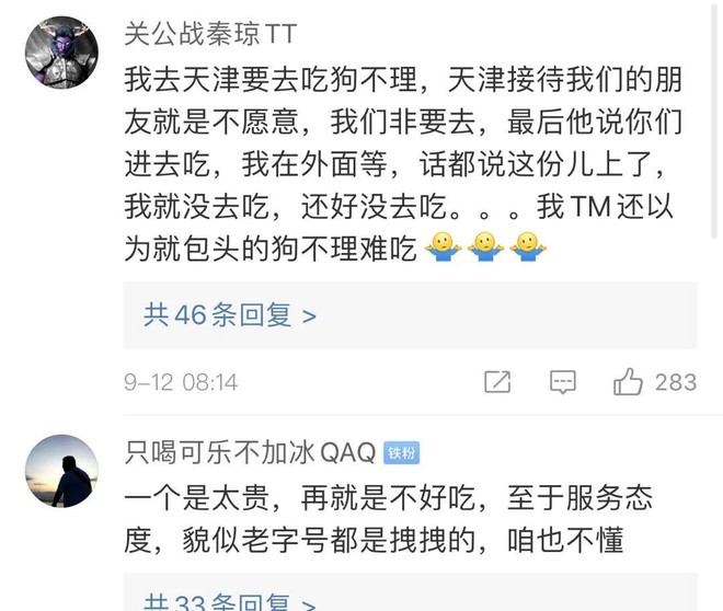狗不理被diss的原因主要有贵、服务差、难吃。这也是不少老字号的通病。