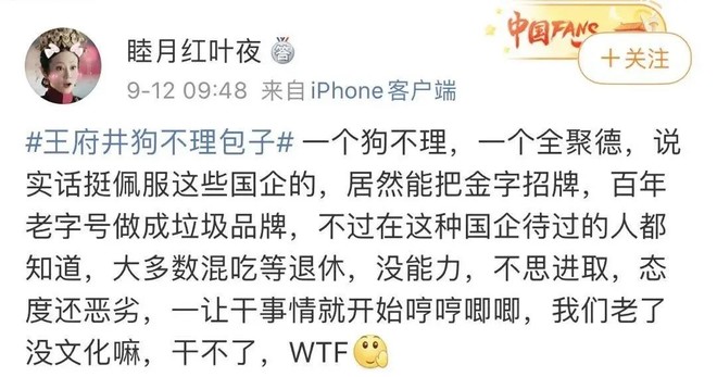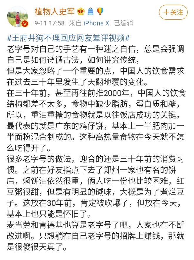 还有网友对于老字号的“危机公关”能力表示失望,“至少应该事先声明实地调查,如果有错一定改正,感谢大家提意见。这样的‘国营买卖’做派,就是‘说不得’。”