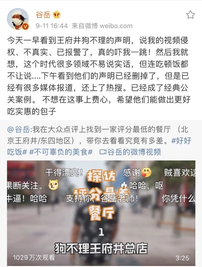 日前,微博博主谷岳发布了一则狗不理包子(王府井总店)的探店视频,视频中该博主在餐厅就餐之后给出差评:“感觉里面全是肥肉”“特别腻”,“要说也没那么难吃,这种质量20块钱差不多,100块钱两屉有点贵。”