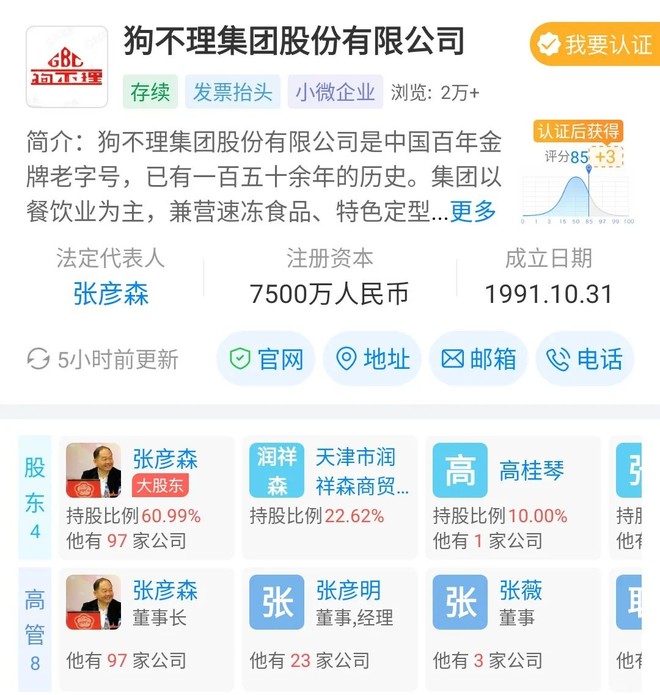 据天眼查数据显示,狗不理集团股份有限公司大股东为张彦森,而另一股东天津市润祥森商贸有限公司也由张彦森控股,狗不理已经成为一家私企。