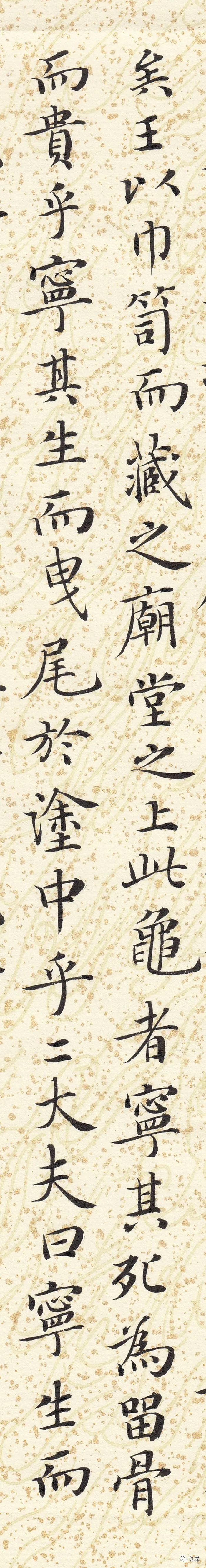 庄子钓于濮水。楚王使大夫二人往先焉,曰:“愿以境内累矣!” 庄子持竿不顾,曰:“吾闻楚有神龟,死已三千岁矣。王巾笥而藏之庙堂之上。此龟者,宁其死为留骨而贵乎?宁其生而曳尾于涂中乎?”二大夫曰:“宁生而曳尾涂中。”庄子曰:“往矣!吾将曳尾于涂中。”