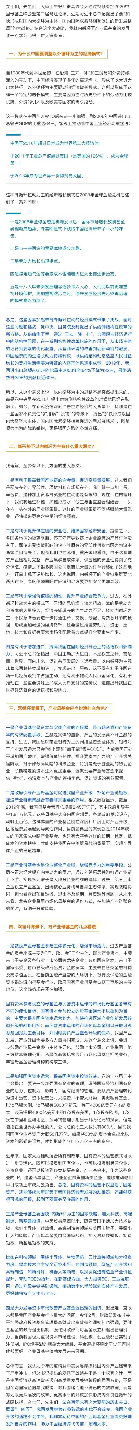 产业母基金要围绕“内循环”为主的国家战略,加大科技、高端制造、新基建投资。