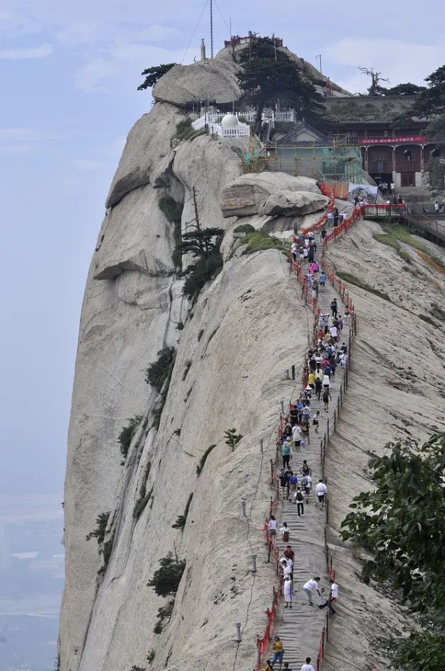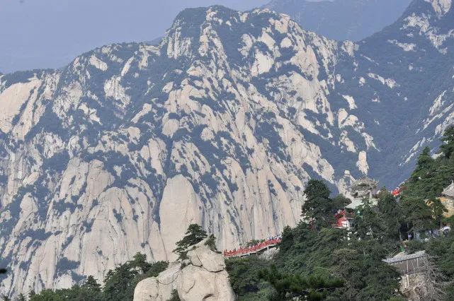 华山山脉是深成侵入岩体的花岗岩浑然巨石,顶部是粗粒(粒径5毫米)斑状花岗岩