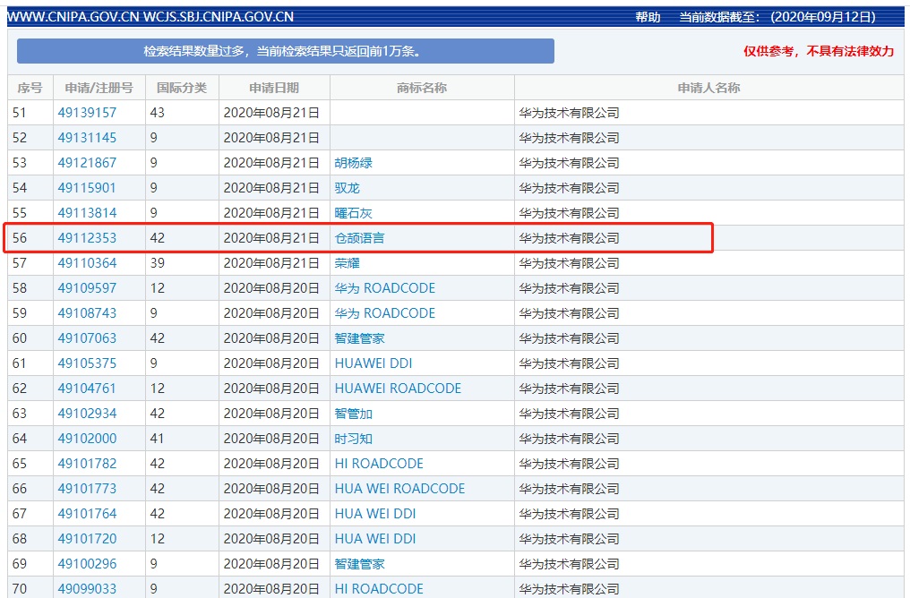 IT之家 9 月 14 日消息 企查查 APP 显示,8 月 21 日,华为技术有限公司新申请两件 “仓颉语言”商标。上述商标状态为:商标申请中,国际分类为第 9 类及第 42 类,其中第 9 类中包含计算机及手机相关的软件程序商品,第 42 类则包含计算机编程服务等。