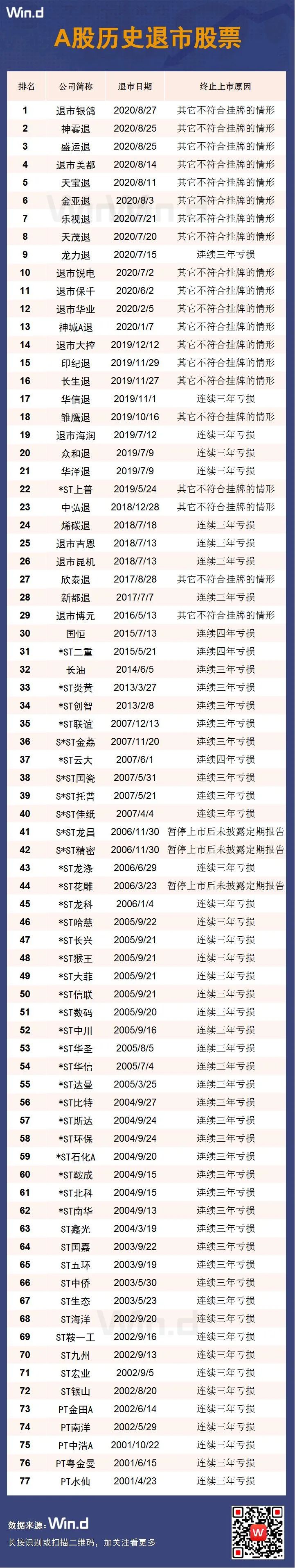 从2001年出现首家退市公司至今,20年间,A股共产生了77家真正意义上的退市公司。