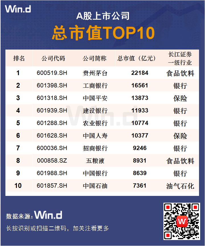 从总市值看,贵州茅台总市值超过两万亿元一马当先,工商银行、中国平安、建设银行、农业银行、中国人寿市值均超过万亿元。