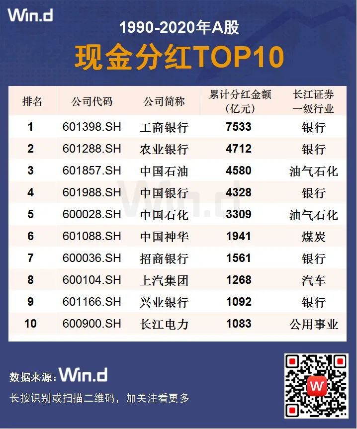 从分红金额看,银行业上市公司最“慷慨”。在现金分红能力上,其他行业与之无法抗衡。A股历史上累计分红最多的10只个股,银行股占据半数。