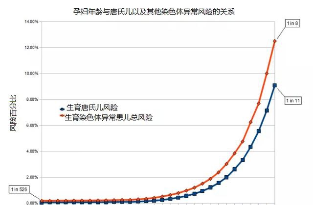 如果加上其他的染色体异常,风险就更高了,到50岁的时候甚至8次妊娠就会有一个染色体异常。