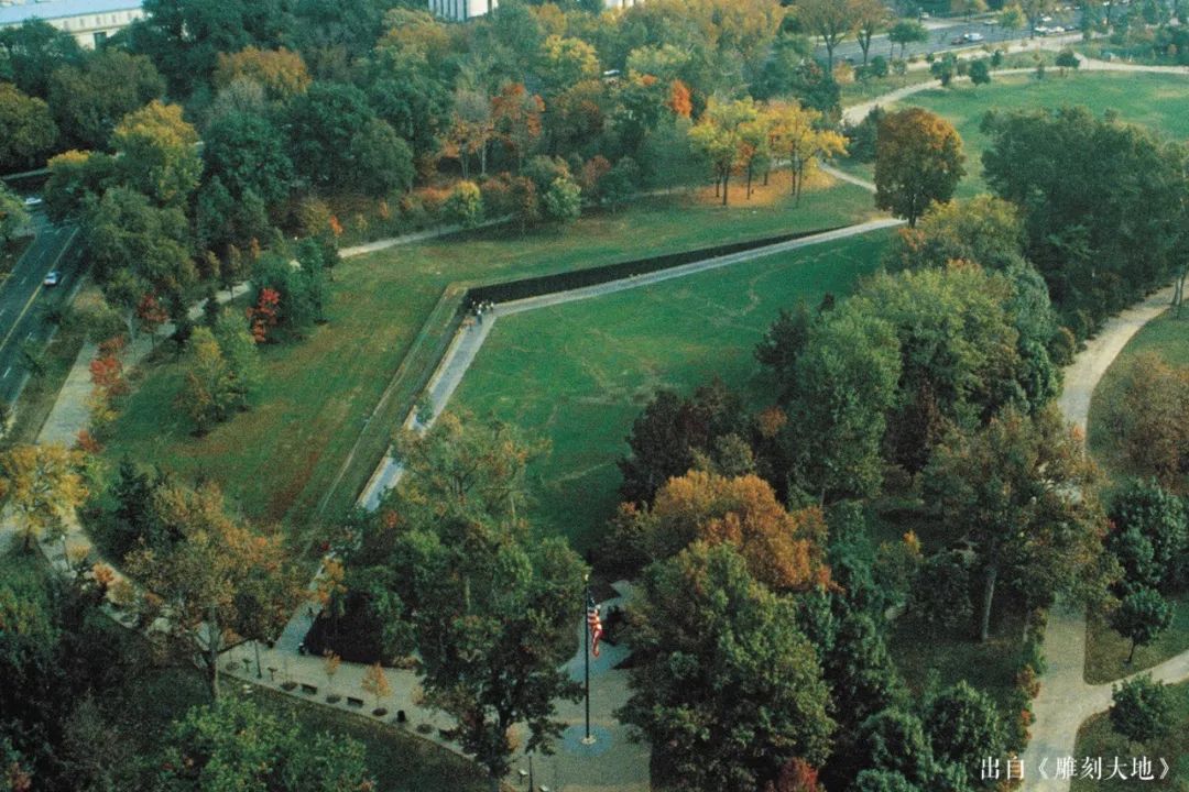 林璎赢了,她的设计是颠覆性的。她的纪念碑,既不像华盛顿纪念碑那样高耸入云,也不像林肯雕像那样具象,而是仿佛用小刀在地面上用力划了个“V”型,一边指向林肯纪念堂,另一边指向华盛顿纪念碑。