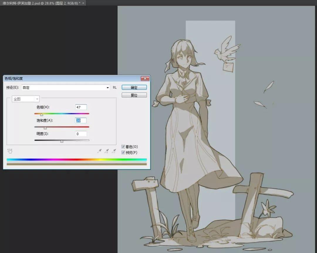 如果在画同人的时候感觉部分颜色不好看,可以进行一些微调整。比如裙摆的白色,我们在处理明暗的时候容易把它画脏,这时加一点冷色或暖色就更方便我们处理。还是那句老话:艺术是源于生活高于生活的。