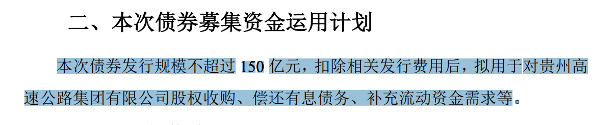 但根据信息披露,贵州省国资委已将所持有的贵州高速的部分股权转让给茅台集团,转让价150亿元,和此次发行债券规模相同。