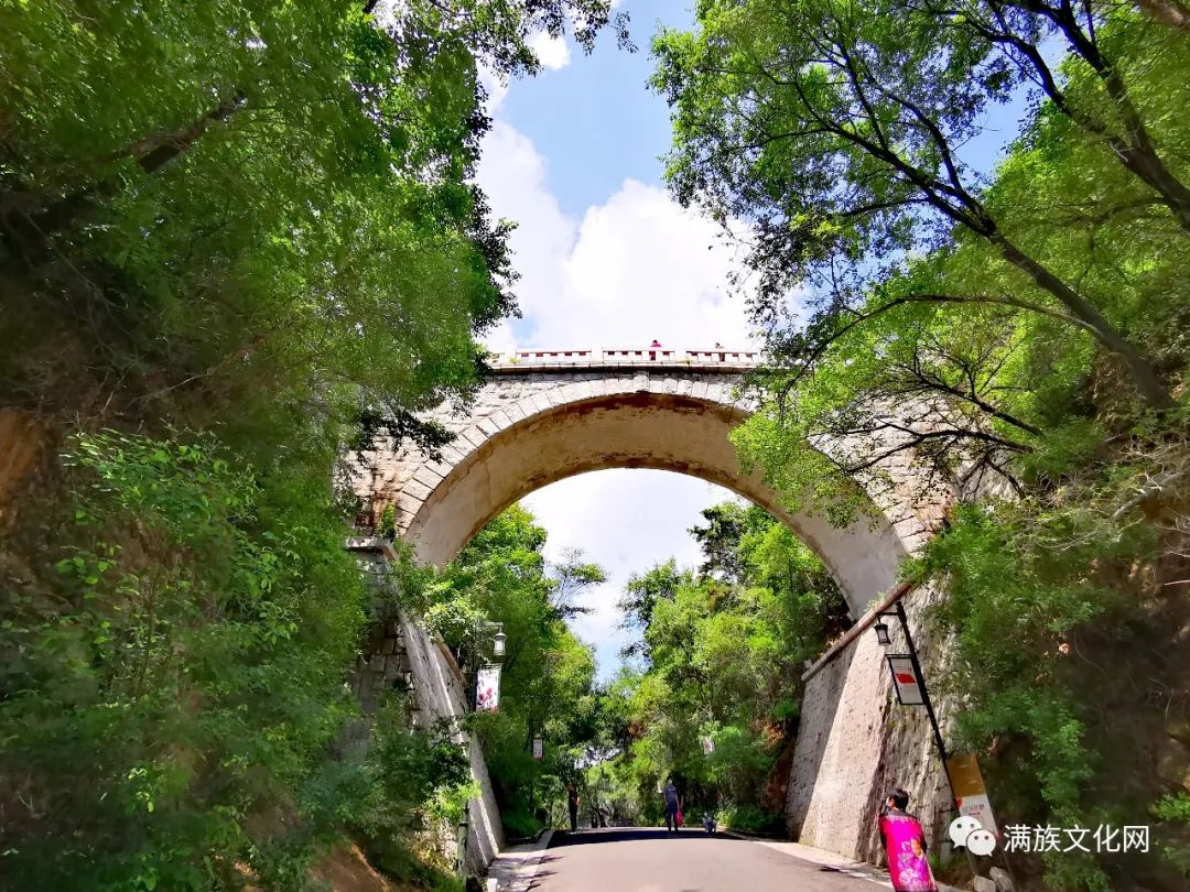 步入绿荫遮蔽的吉林市北山公园登山峡谷通道,不久就会看到一座花岗岩拱桥,凌空横跨峡谷上空,如彩虹飞渡,气势凌云。