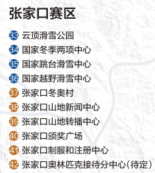 国家跳台滑雪中心:国家跳台滑雪中心位于张家口赛区崇礼奥运场馆群,是张家口赛区标志性新建场馆,将进行冬奥会跳台滑雪和北欧两项项目的比赛。场馆造型与中国传统吉祥物件“如意”外形相似,因此又称“雪如意”。