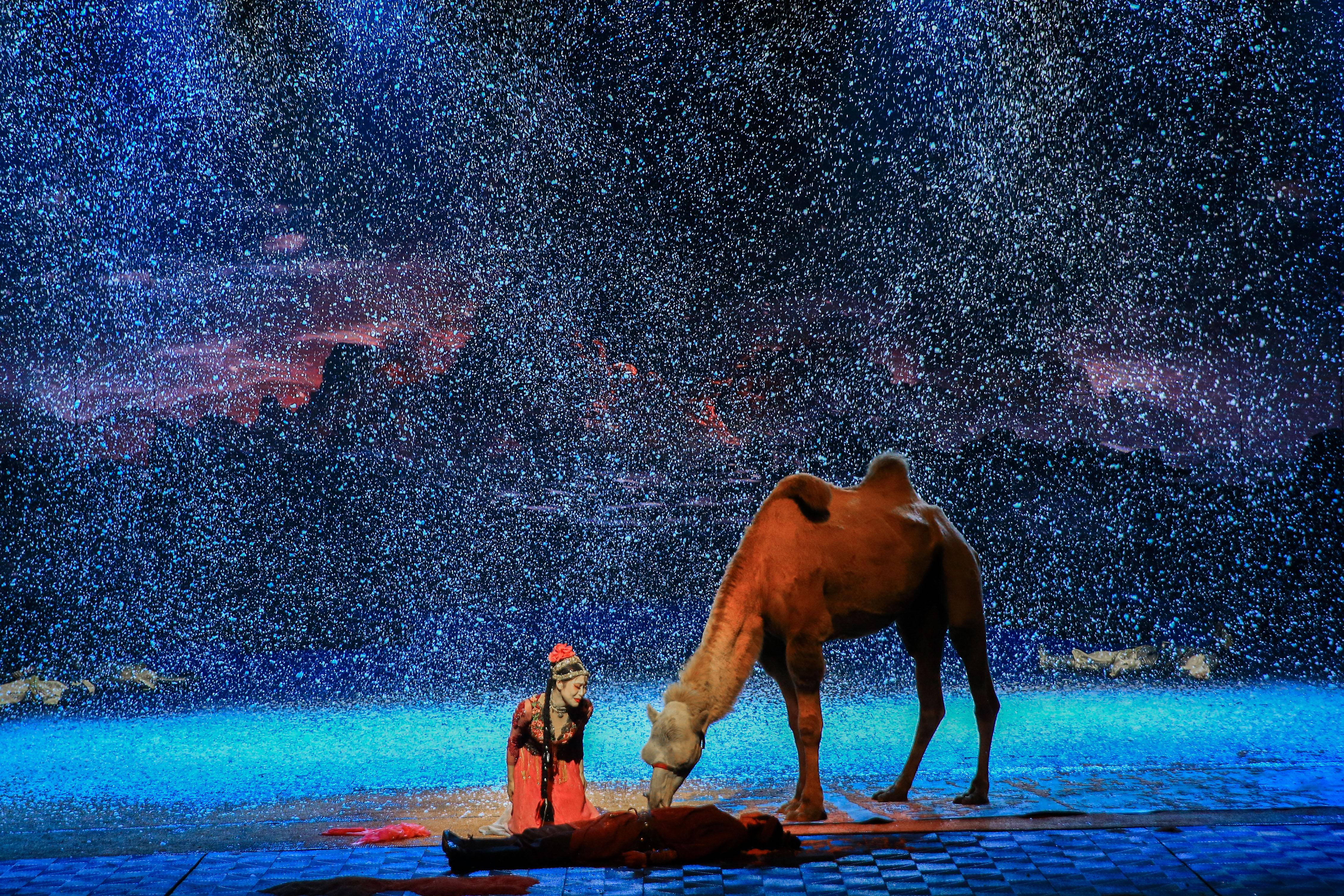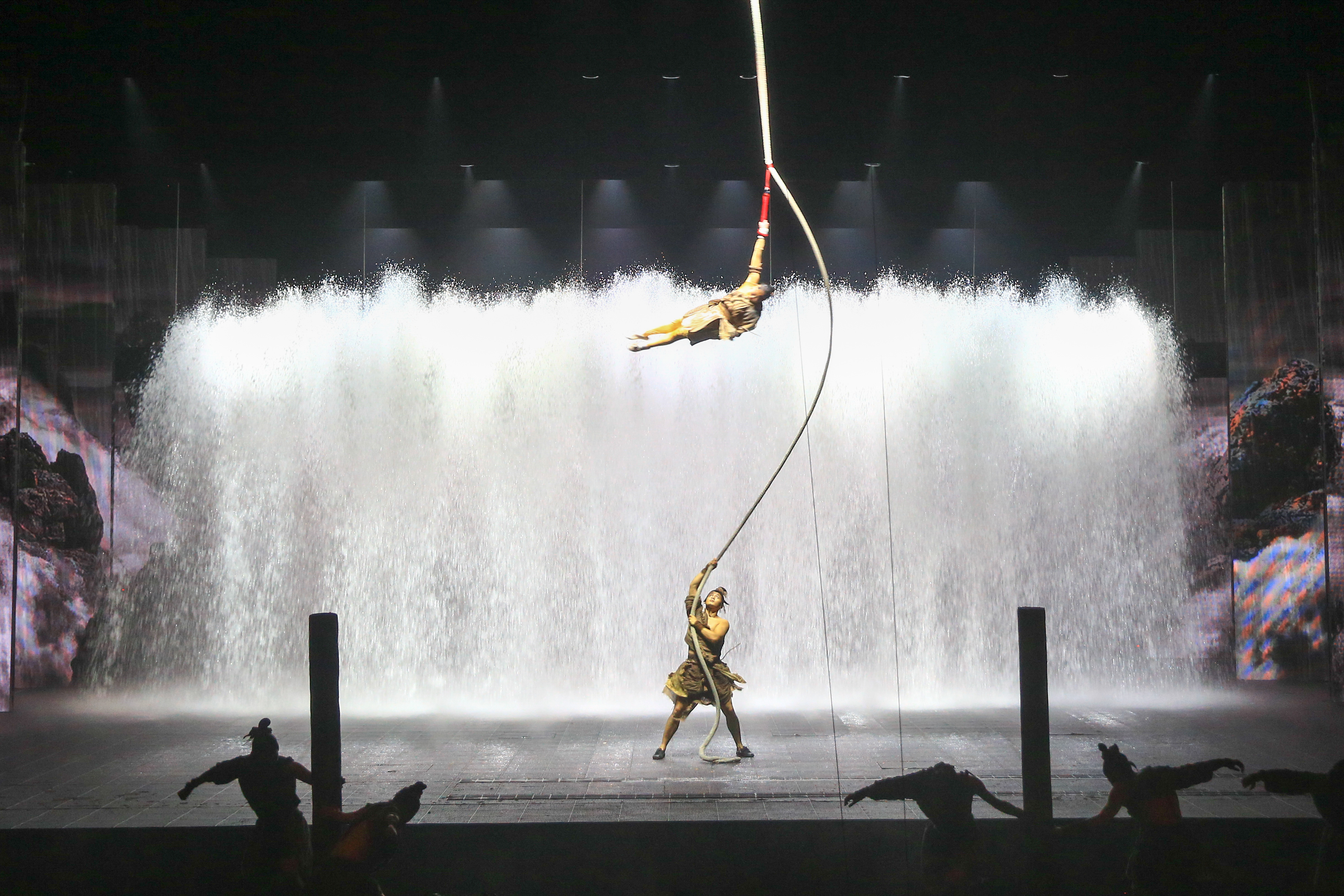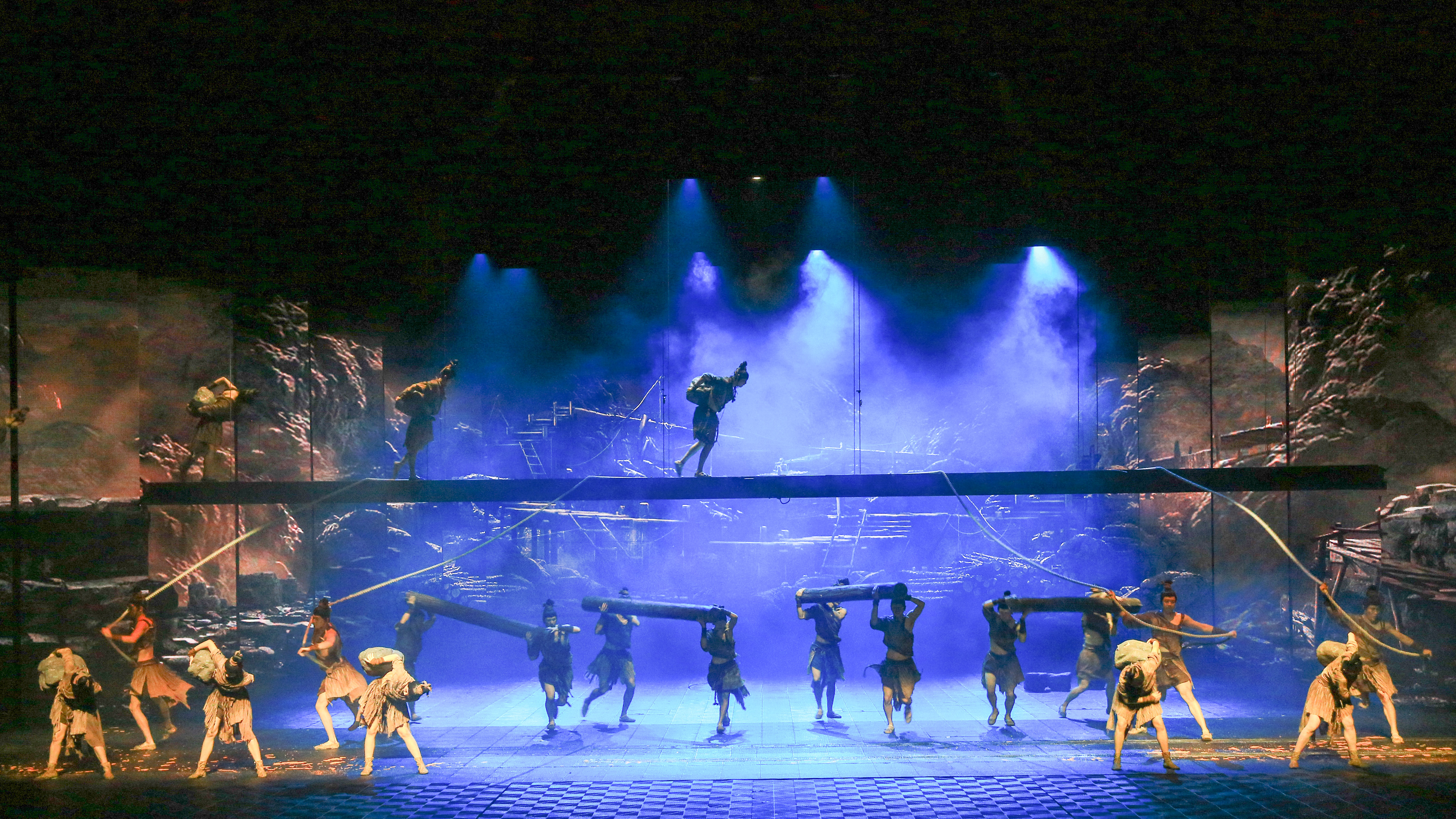 上万套机械与设备满场运转,三千吨大洪水倾泻而下,数百立方黄沙扑面而来,用虚实结合的表现手法打破舞台与观众区域的界限,沉浸式地感受一场艺术盛宴。