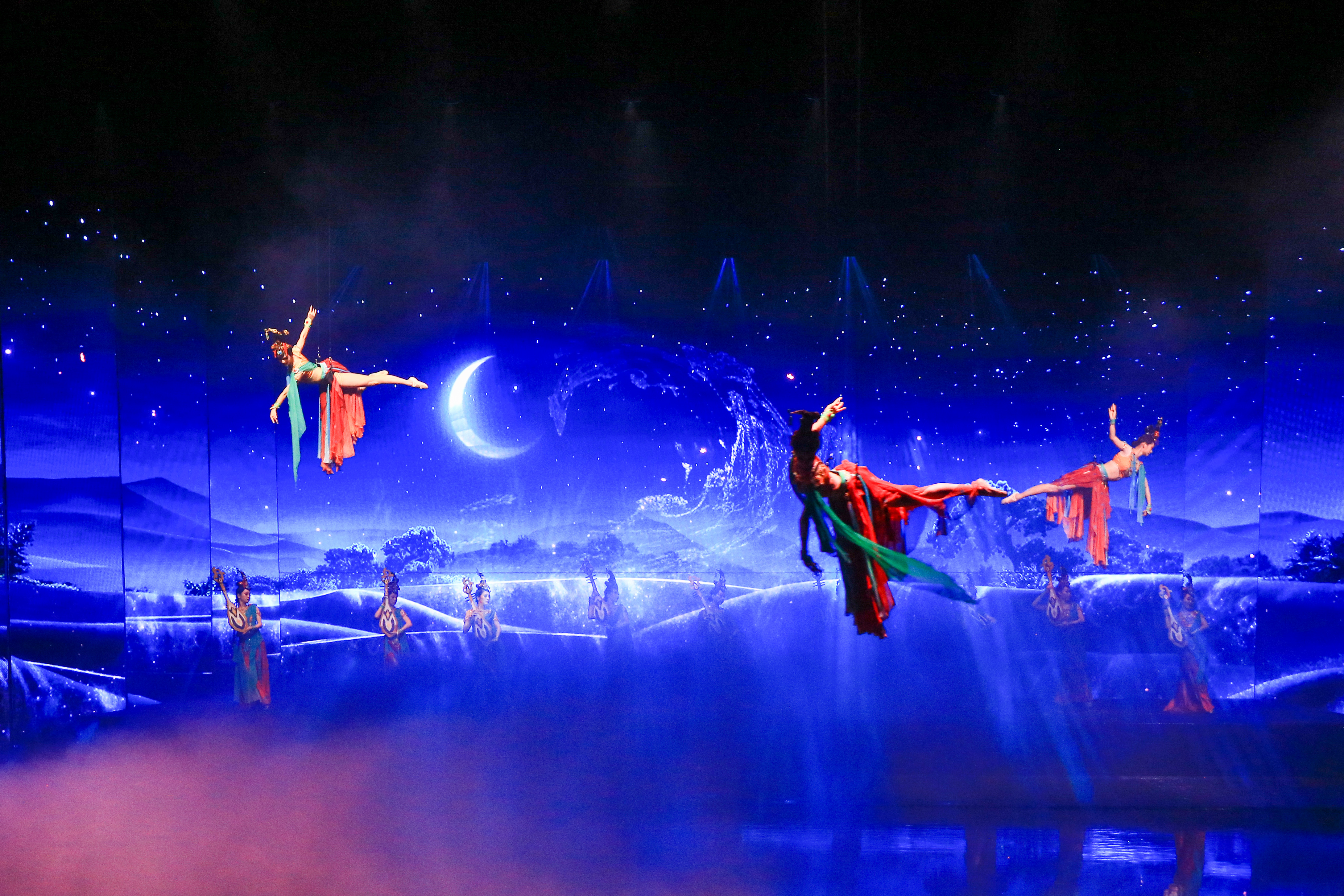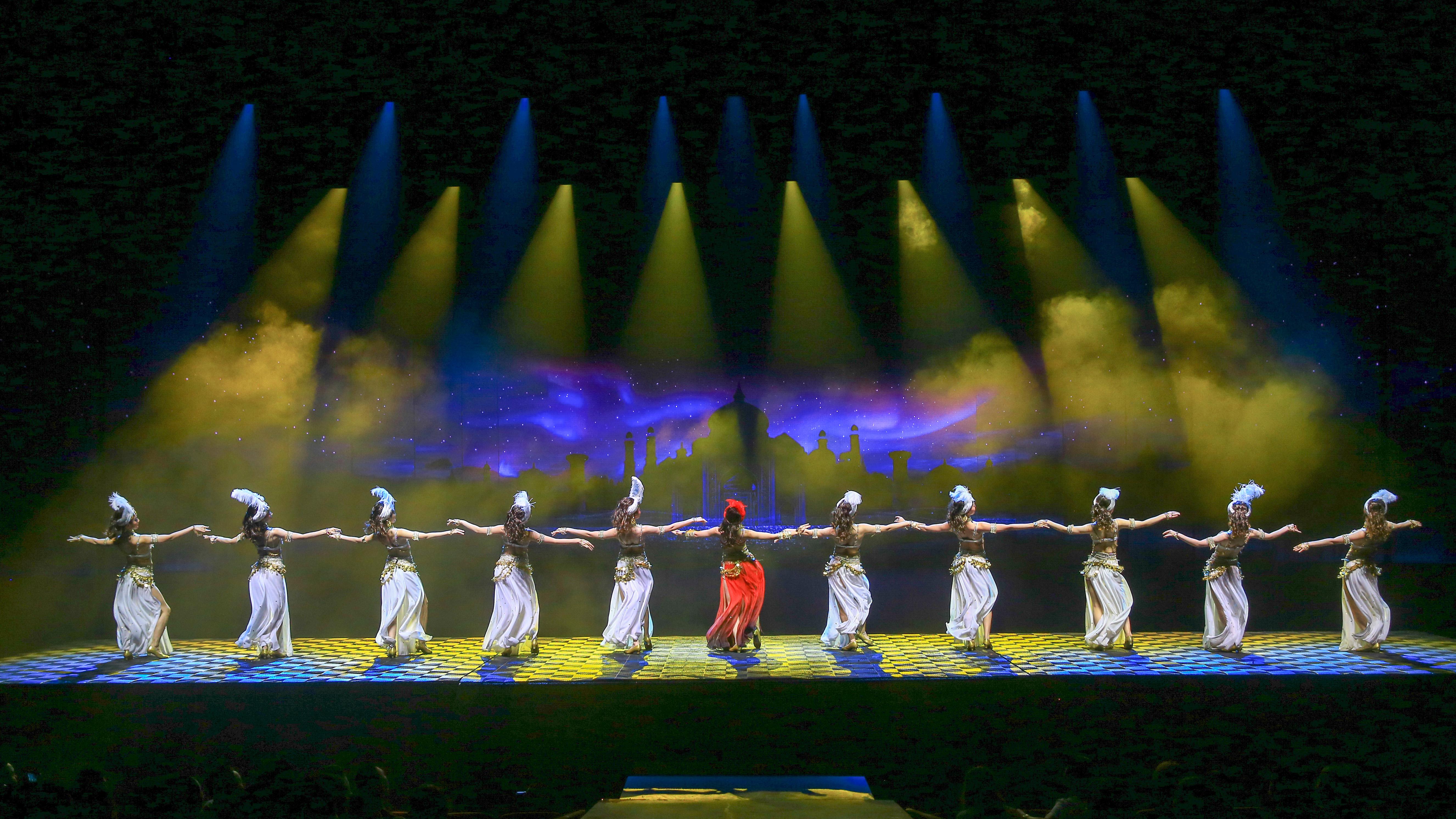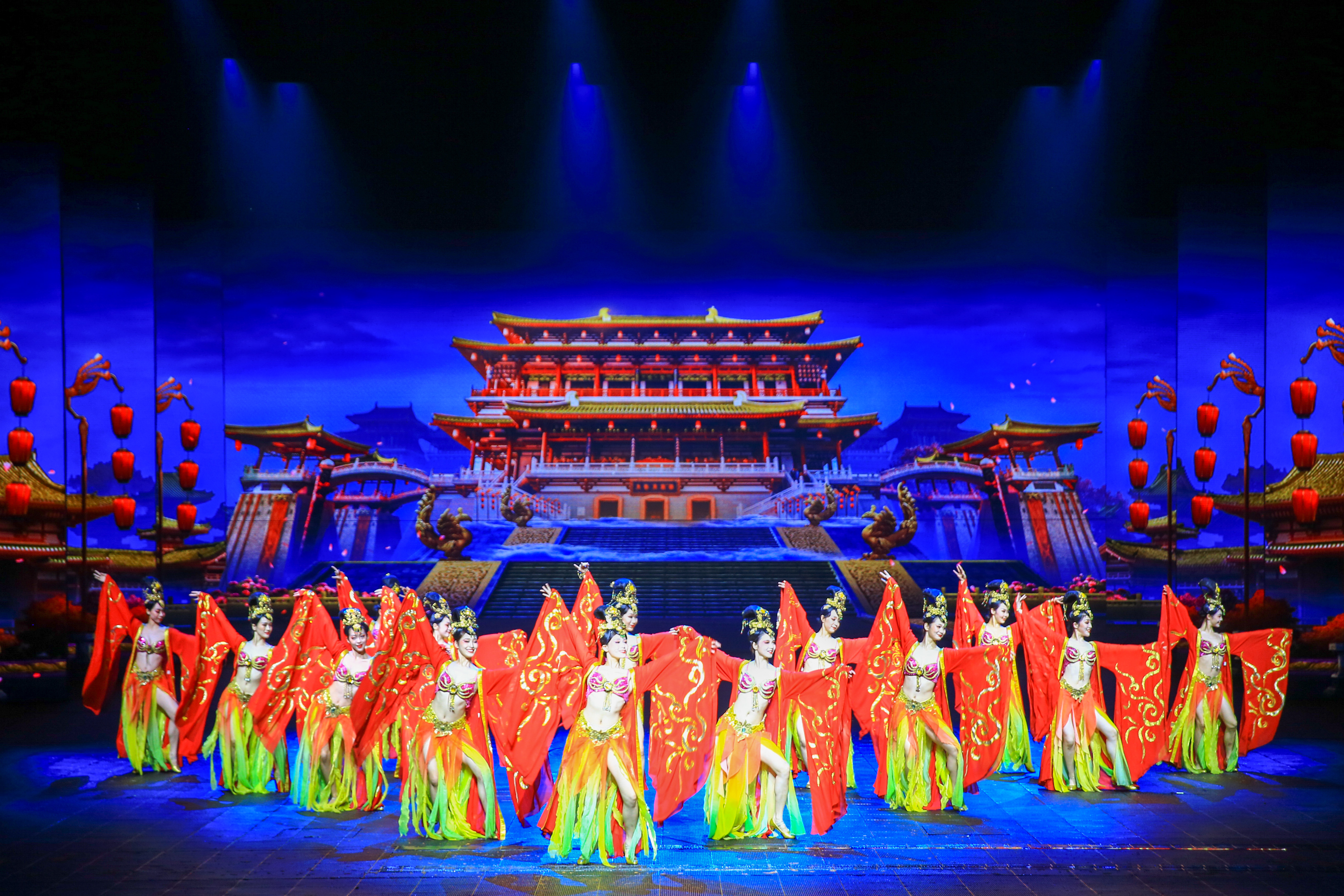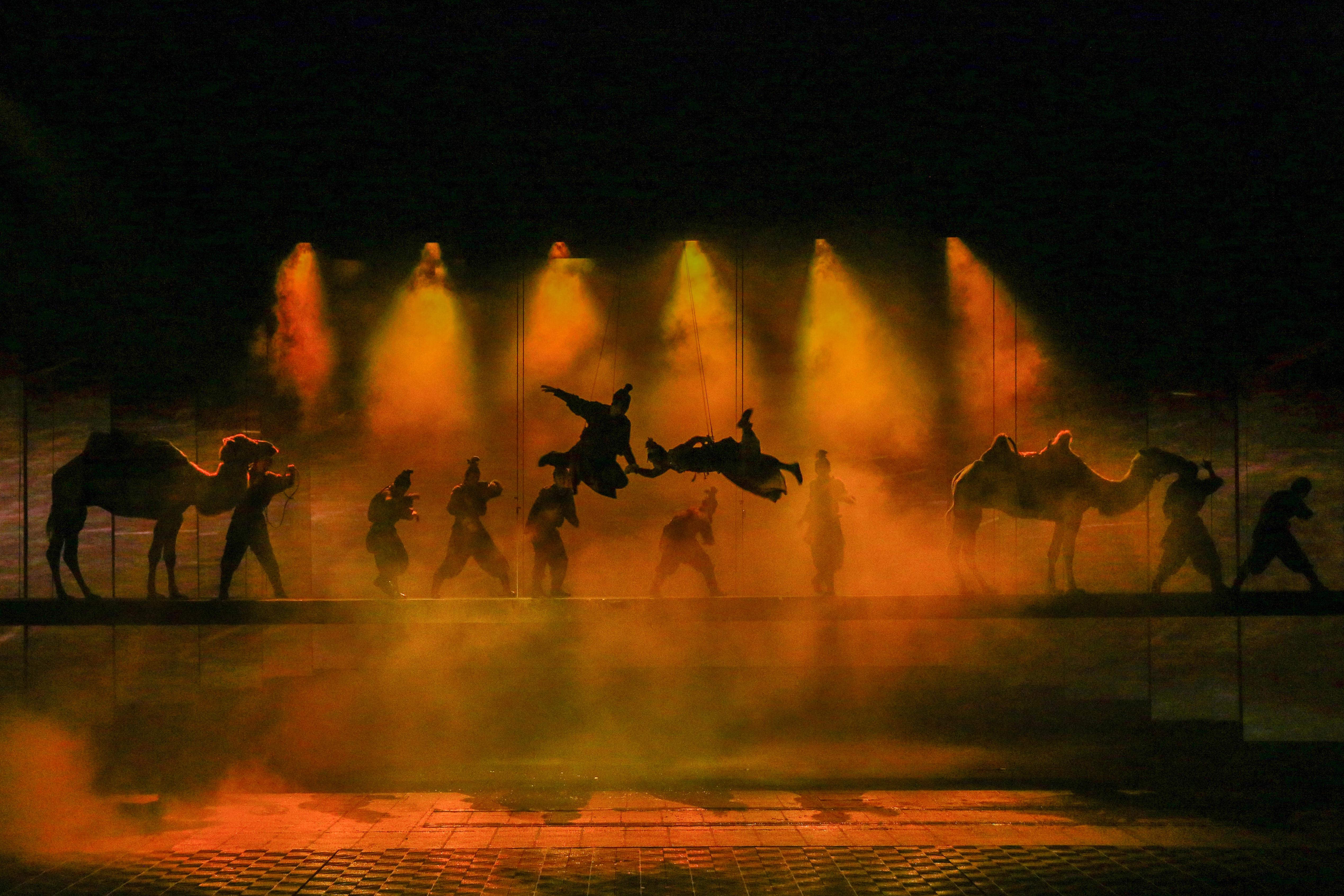 歌舞《西安千古情》以一位华裔少女回国寻根的故事为主线,开启一次寻找民族记忆之旅,分为《文明之光》《灞河之洲》《大禹治水》《大唐盛世》《丝绸之路》等场。