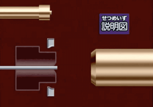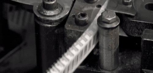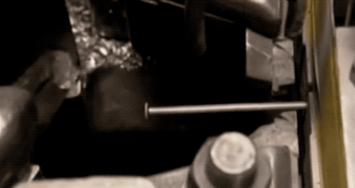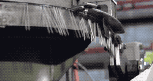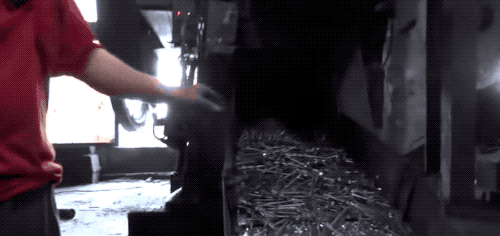 然后就到了我们最好奇的制钉环节!先看钢丝被送进机器后,是怎么被裁断的…… 正常速度。