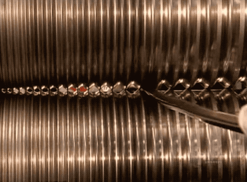 所以我们再来看钉子在制作时,是怎么被尖头朝向一边,然后再成卷排列到一起的~