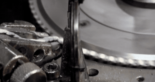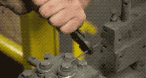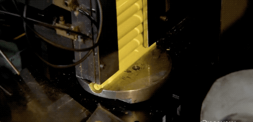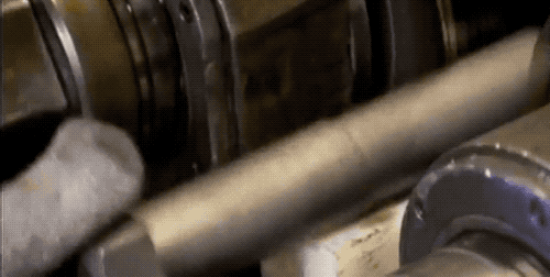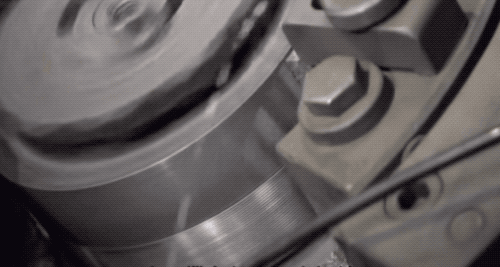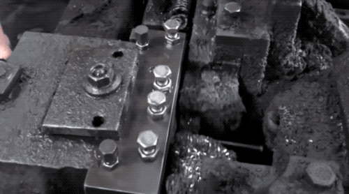 热处理过了的螺栓冷却后,就可以去“刻”螺纹啦~把螺栓放到两个圆筒滚轴之间,滚轴上有刻好的螺纹,机器用 40 公斤的压力就能在螺栓上“压”出螺纹。