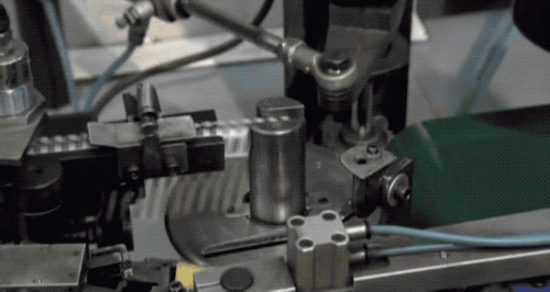 先在钉帽上打出一个凹坑,然后送到进钉口(注意看那个结合处的空余部位,相当于是个模具),钉帽受到冲压机的大力挤压产生形变,带凹坑的就会紧紧包裹并夹住钉柱,这就图钉一体化了!