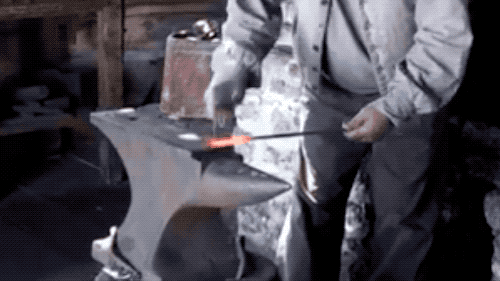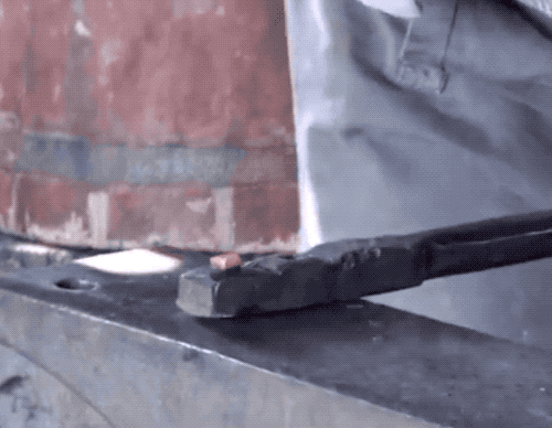 在开始今天的流水线之前,我们先来看下纯手工打造一个钉子有多么麻烦……我查了一些标准的手打钉资料,大概是:把小铁杆的前端烧到火热后,要一直不停的捶打敲细、敲尖。