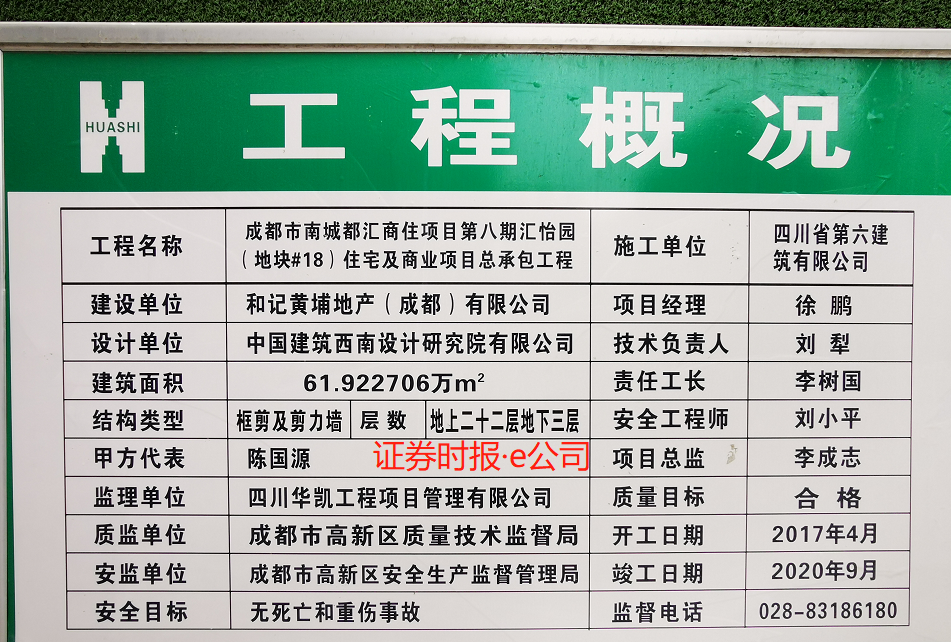 通过实地探访,证券时报·e公司记者了解到,在拿地16年之后,和黄成都“南城都汇”项目还有第7、8期未售,约有房源近7000套,目前建筑主体几乎已经竣工。需要指出的是,2020年7月,长江实业集团有限公司(以下简称长实集团)已将所持“南城都汇”项目股权已于转售禹洲集团控股有限公司(01628.HK)(以下简称禹洲集团),而和记投资有限公司则还持有和黄成都50%股权。