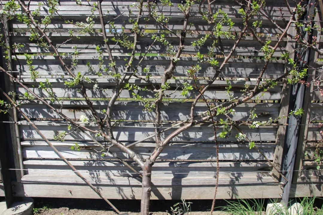 此外李子树跟其他果树一样,也很适合做成平面种植,像下图这样贴着墙种,一方面节省地方,一方面也不影响接受阳光,只要是向东,向南,都很好。