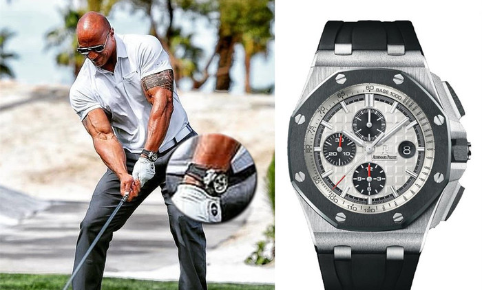 强森在户外运动时,比如打高尔夫,佩戴的是爱彼皇家橡树离岸型,公价为26万。