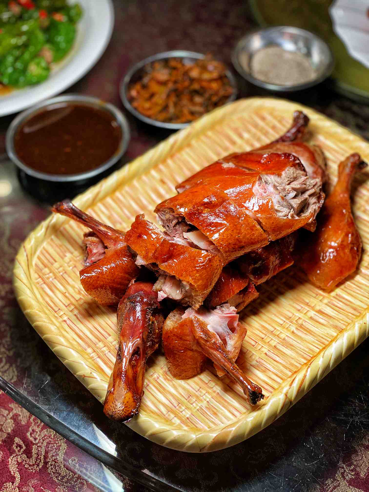 离开抚仙湖去宜良,中午在那里吃小刀鸭。以前就知道宜良烤鸭,后来在北京七彩云南大酒楼吃了昆明小刀鸭,觉得比在云南吃的好吃。黄静昆师傅告诉我,他们餐厅的小刀鸭,就是宜良烤鸭的变种,不过是请来粤菜中烧腊师傅做了改良,鸭子个头小了一些,烤制上更加精细而已。