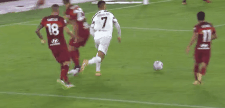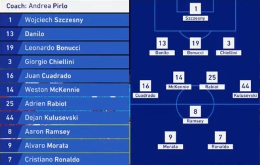 而尤文这边,皮尔洛非常大胆且激进,几乎排出了一个3-4-3,回到老东家的莫拉塔搭档C罗和拉姆塞组成前场进攻组合。
