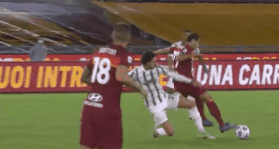 第30分钟,比赛转折点出现,拉比奥禁区内手球犯规,裁判判给罗马队一个点球。
